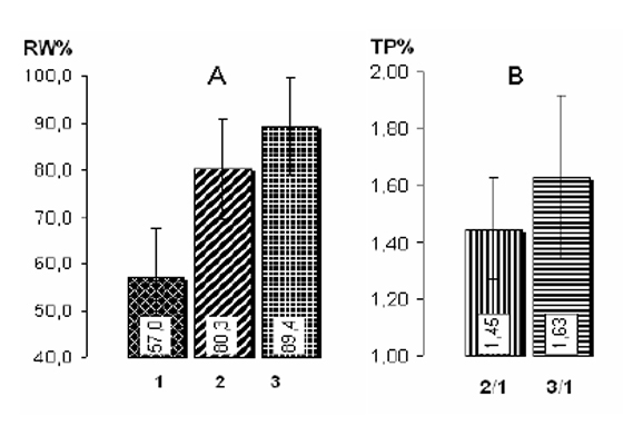 Նկ. 1 Հիշողության արդյունավետության դինամիկան ըստ հետազոտված ուսանողների տվյալների: A, B – hիշողության արդյունավետության և սովորեցման գործընթացի դինամիկան համապատասխանաբար: Նշանակումներ. RW% – հիշողության արդյունավետությունն (ինտեգրալ ցուցանիշ) արտահայտված տոկոսներով; 1 – երեք բառախմբերի առաջին ներկայացումների միջին արժեքը, 2, 3 - բառախմբերի երկրորդ և երրորդ ներկայացումների միջին արժեքները համապատասխանաբար: TP% – սովորեցման գործընթացի արդյունավետությունն արտահայտված տոկոսներով; 2/1, 3/1 – սովորեցման արդյունավետության գործակիցներն ըստ առաջին - երկրորդ և առաջին - երրորդ ներկայացումներում գրանցված արդյունքների հարաբերության: Սյուներն հատող ուղղահայց գծերով ցույց են տրված ցուցանիշների ստանդարտ շեղումները: