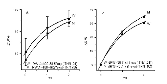 Նկ. 2 Հիշողության արդյունավետության դինամիկան արտահայտող ռեգրեսիոն կորերը ուսանողների և ուսանողուհիների մոտ: A – հիշողության արդյունավետության բացարձակ աճը RW% և B – հավելաճը DRW բառախմբերի երեք ներկայացումներում TN – 0; 1; 2 համապատասխանաբար: Նշանակումներ. M (Men)– ուսանողներ, W (Women) – ուսանողուհիներ: Կորերը կառուցված են երեք տարբեր բառախմբերի ներկայացումների տվյալների հիման վրա: Էքսպոնենցիալ կորերի հավասարումների գործակիցները հաշվարկվել են Լեվենբերգ-Մարկարդի ալգոռիթմի օգնությամբ: