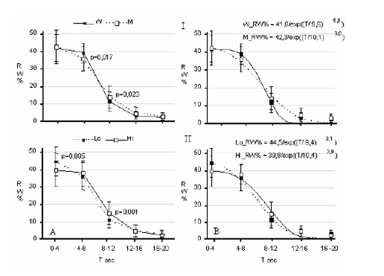 Նկ. 3 Վերարտադրված բառերի ժամանակային դինամիկայի ռեգրեսիոն կորեր; l – ուսանողների և ուսանողուհիների խմբեր, ll –ըստ հիշողության արդյունավետության ցուցանիշի առանձնացված խմբեր: A – նախնական տվյալներ. B – հարթեցնող (շտկող) ռեգրեսիոն կորեր: Նշանակումներ. W – ուսանողուհիներ, M – ուսանողներ: Low –վերարտադրված բառերի քանակի ցածր և High – բարձր մակարդակներ ցուցաբերած հետազոտվածների խմբերը: Մյուս նշանակումները տես նկ. 2- ում: