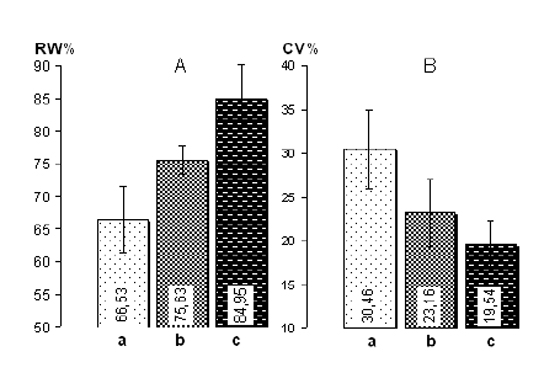 Նկ. 4. Հիշողության արդյունավետության RW% (A) և ժամանակային փոփոխականության CV% (B) ցուցանիշների դիագրամ. Նշանակումներ. a, b, c – ըստ ՀԱ ցուցանիշի միջին արժեքի առանձնացված երեք խմբեր. ցածր, միջին, բարձր համապատասխանաբար: Խմբերը կազմվել են ըստ պերսենտիլ (percentile) ֆունկցիայի: