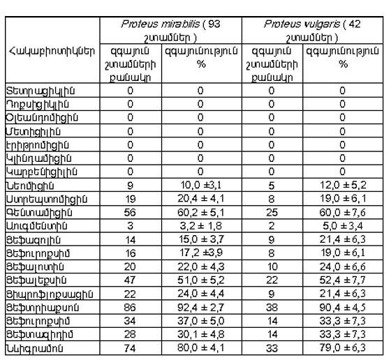 P. mirabilis և P. vulgaris շտամների զգայունության արդյունքները հակաբիոտիկների հանդեպ ներկայացված են թիվ 1 աղյուսակում:
