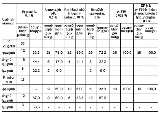 P. vulgaris և P. mirabilis շտամների զգայունության ուսումնասիրության արդյունքները տարբեր դեզինֆեկտանտների հանդեպ ներկայացված են թիվ 2 աղյուսակում, և ինչպես պարզ է դառնում` նոր ախտահանիչների հանդեպ ( A- 660-ի 0,025%-ոց լուծույթ, ПБ- ի և А- 660-ի հիմքի վրա ստեղծված կոմպոզիցիայի 0,01%-ոց լուծույթ) զգայունությունը կազմել է 100%: