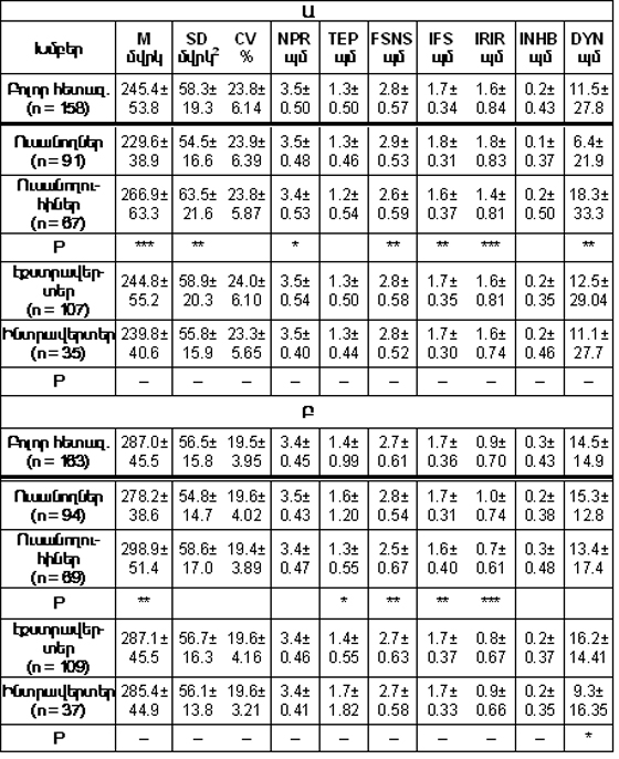 Տեսողական ազդակների ռիթմիկ (Ա: և առիթմիկ (Բ: ներկայացմամբ ընթացող ռեֆլեքսամետրիկ թեստի երկու տարբերակներում գրանցված տեսա-շարժիչ ռեակցիաների հիմնական ցուցանիշները բոլոր հետազոտվածների մոտ և առանձնացված խմբերում (M±σ):