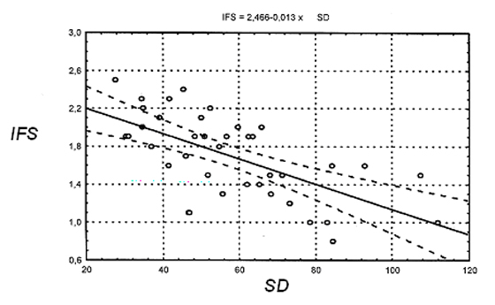 Նկ. 1 Տեսողական ազդակների ռիթմիկ ներկայացմամբ տարբերակի ցուցանիշների փոխկապվածության սկատերոգրամը ըստ ԿՆՀ ֆունկցիոնալ վիճակի ինդեքսի (IFS) և ռեակցիայի ժամանակի փոփոխականության (SD) տվյալների: Սկատերոգրամներում տրենդները համապատասխանում են գծային ռեգրեսիայի հավասարումներին: Կետագծերով արտահայտված են վերլուծվող ցուցանիշների ռեգրեսիոն կապվածության 95% արժանահավատ ինտերվալները: