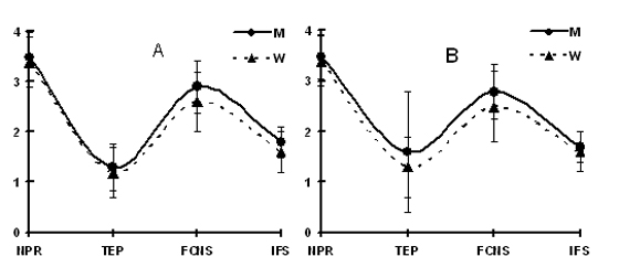 Նկ. 2. Ռեֆլեքսամետրիկ թեստերում ստացված մի շարք ցուցանիշների միջխմբային առանձնահատկություններն արտահայտող դիագրամ: Նշանակումներ. A – տեսողական ազդակների ռիթմիկ և B – առիթմիկ ընթացքով թեստերի համապատասխան ցուցանիշներ: M-ուսանողներ, W-ուսանողուհիներ. Հապավումների բացատրությունները նայել տեքստում: