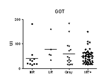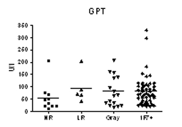 Նշված խմբերում շիճուկային ԱԼՏ-ի և ԱՍՏ-ի մակարդակների վերաբերյալ ստացել ենք հետևյալ տվյալները` ԱԼՏ-ի միջին մակարդակը 1F7 NR խմբում նշանակալից ցածր է 1F7 ԼR և R խմբերի համեմատ (77,4±21 Մ/լ,1 և 59,1±12,5 Մ/լ): 1F7 ԼR և Gray խմբերում ԱԼՏ-ի միջին մակարդակների տարբերությունը նշանակալից չէ 1F7 R խմբի համեմատ (48,6+3,6 Մ/լ ), սակայն ԱԼՏ-ի մակարդակը նշանակալից տարբեր է 1F7 ԼR և Gray խմբերում ( Pt ‹ 0,0001 ) (նկ. 5):