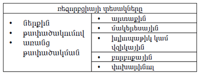Դրա հետ միասին կլինիկական դեպքերի որոշ տվյալներ ցույց են տալիս ներքին ռեգորբցիայի առկայությունր նաև առոդջ, դեռես չծկթած ատամներում: Ներքին ռեգորբցիան առաջ է գալիս նաե կարիեսի առաջրնթացի արդյունքում' որպես հերթափոխվոդ պրոցես, որի դեպքում ակտիվ ռեգորբցիայի փուլին հաջորդում է պասիվ շրջանր: Ոեմիսիայի փուլի րնթացքում կարոդ է շերտադրվել նոր կարծր հյուսվածք' իռեգուլյար դենտինի ձեով: Թեե ներքին ռեգորբցիայի առաջացման պատճառները ամբոդջությամբ հայտնի չեն, այնուամենայնիվ կան հետագոտություններ, որոնք հաստատում են ատամի պուլպայի բորբոքման ե բակտերիալ գործոնի առաջնային դերր այս վիճակների պաթոգենեգում [1,12,15,16]: Ամբոդջացնելով բորբոքման պատճառներր, որոնց հետեանքով տեդի է ունենում ռեգորբցիա, կարոդ ենք ստանալ էթիոլոգիկ գործոնների այսպիսի խումբ [3,10,11].