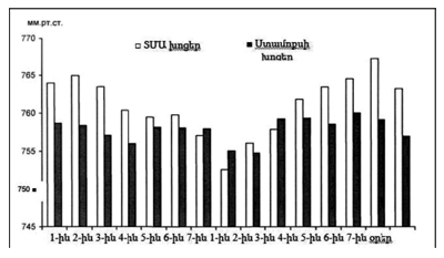 Նկար 1. Մթնոլորտային ճնշման տատանումներից կախված ստամոքսի ե 12- մատնյա աղու խոցերից արյունահոսությունների կայացման դինամիկայի գրաֆիկ