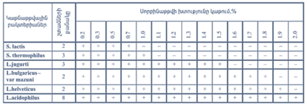 Սորբինաթթվի նկատմամբ կաթնաթթվային բակտերիաների զգայունությունը տարբեր է: Կաթնաթթվային ստրեպտոկոկերը լրիվ ճնշում են սորբինաթթվի 0,7-1,0, ցուպիկավոր կաթնաթթվային բակտերիաների` 1.5-2,0%-ին (աղյուսակ 1):