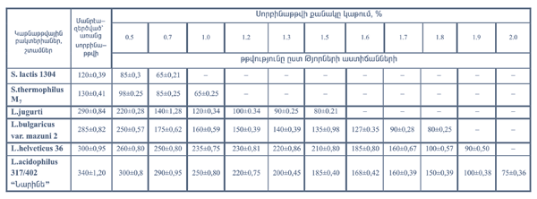 Ուսումնասիրել ենք կաթնաթթվային բակտերիաների 20 շտամներ, որոնք մեկուսացվել են ՀՀ ԳԱԱ միկրոբիոլոգիայի և մանրէների ավանդադրման կենտրոնի խմորող միկրոօրգանիզմների լաբորատորիայում: Այդ շտամներից Streptococcus thermophilus Մ7 (ԻՆՄԻԱ-9608), Lactobacillus jugurti (ԻՆՄԻԱ), Lactobacillus acidophilus 317/402 «Նարինե» (ԻՆՄԻԱ-9602), Lactobacillus bulgaricus var. mazuni N2 և «Կարինե» (ԻՆՄԻԱ-9603), Lactobacillus helveticus, Lactobacillus acidophilus 13 Արագած (ԻՆՄԻԱ-9605), Lactobacillus acidophilus 92 Անի (ԻՆՄԻԱ-9606), Lactobacillus acidophilus խ2 (ԻՆՄԻԱ-9609) ավանդադրված են ԳԱԱ միկրոբիոլոգիայի և մանրէների ավանդադրման հավաքածուի մեջ [7] և արտոնագրված ՌԴ-ում, ՀՀ-ում: Կաթնաթթվային բակտերիաների դիմացկունությունը սորբինաթթվի հանդեպ որոշվել է կաթում, որին նախապես ավելացվել է որոշակի քանակներով սորբինաթթու: Այդ ընթացքում որոշվել է նրանց մորֆոլոգիական, օրգանոլեպտիկ, [7] թթու առաջացնող հատկությունները: Թթվայնությունը որոշվել է ըստ Թյորների սանդղակի [5]: