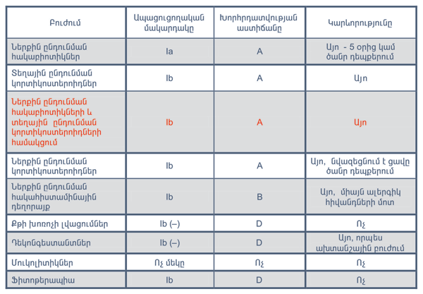 Ալերգոլոգների և կլինիկական իմունոլոգների եվրոպական ակադեմիայի և ռինոլոգների եվրոպական ասոցիացիայի հետ համատեղ ստեղծած աշխատանքային խումբը (ARIA) առաջարկել է ոչ ինֆեկցիոն ծագման ալերգիկ ռինոսինուսիտների բուժման սխեմա, ըստ որի բուժման առաջնային ընտրության դեղորայք են ներքթային կորտիկոստերոիդները [3] (աղյուսակ 1):