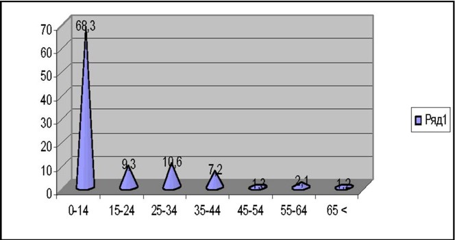 Բոլոր տարիների ընթացքում դեպքերի մոտ 2/3-ը, կամ 64.7% կազմել են մինչև 14 տարեկանները (ամեն 10 հիվանդից 6-7-ը երեխաներ են), ընդ որում այդ ցուցանիշը հասել է առավելագույնի 1983թ.` 1261.9 (100 000 մինչև 14 տարեկանների հաշվով): Ընդհանուր առմամբ, սկսած 1983թ., նկատվել է մանկական հիվանդացության տեսակարար կշռի նվազում` 75.1%-ից (1982թ.) մինչև 54.0% (2005թ.): Մանկական հիվանդացության կառուց-վածքում միջինը 46.2% բաժին է ընկնում 0-2 տարեկաններին, իսկ գումարային միջինը երեխաների կյանքի առաջին 6 տարիների ընթացքում կազմել է 69.5% (աղյուսակ 2, նկար 3):