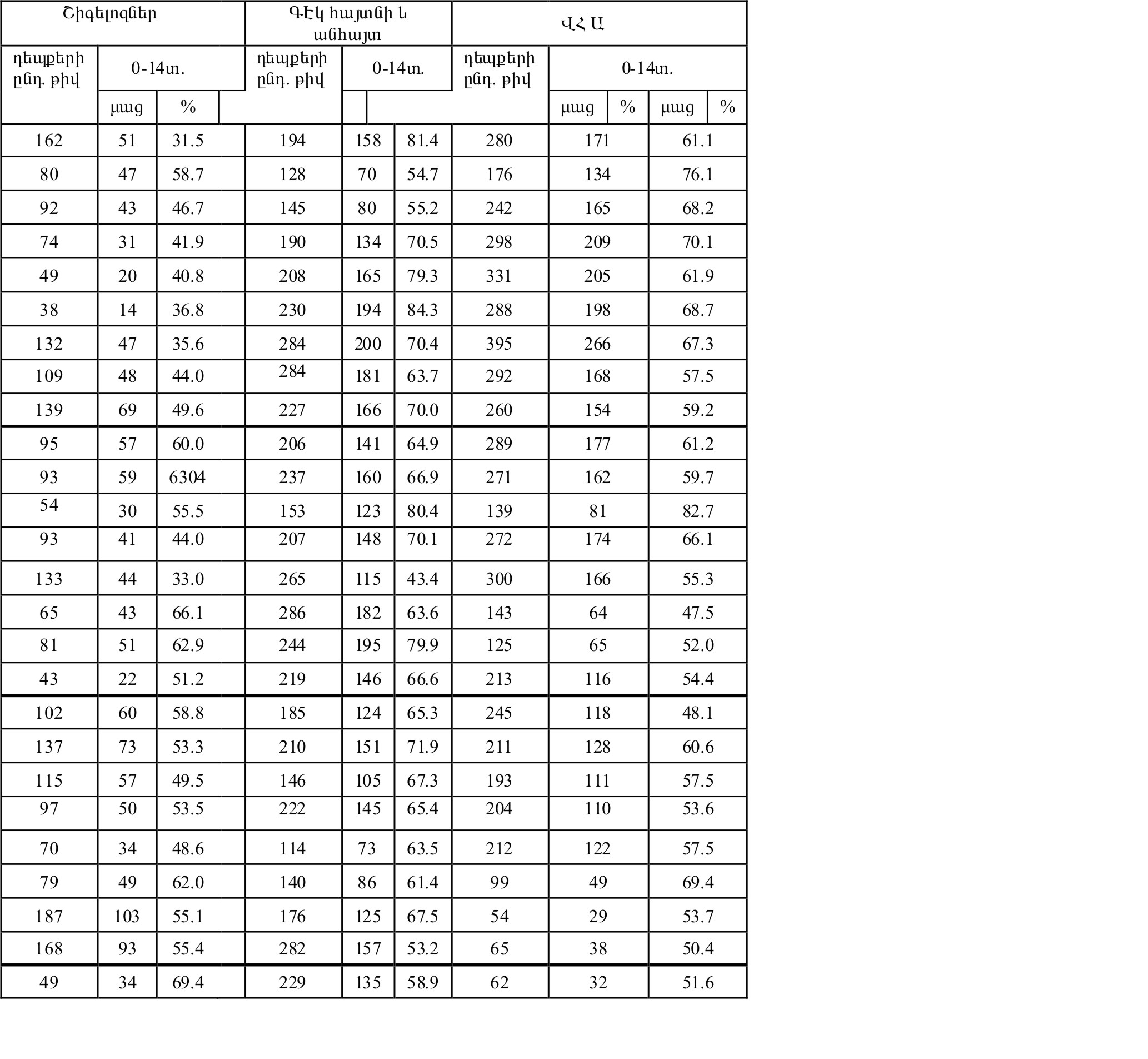 Տասնհինգ և բարձր տարիքի ազգաբնակչության հիվանդացութ-յունը կազմել է համապատասխանաբար 119.1, 181.1, 204.6` 100 000 15 և բարձր ազգաբնակչության հաշվով: Ընդհանուր հիվանդացության մեջ մինչև 14տարեկան և 15տարեկանից բարձր տարիքային խմբերի մասնաբաժինը ըստ ժամանակահատվածների կազմում է 68.3%, 64.1%, 58.3% և 31.7%, 41.3%, 39.4%: Երկրաշարժի տարիներին ԱՎ-ով հիվանդացության մեջ մեծահասակների մասնաբաժինը ավելացել է 9.6%-ով: Տիֆ-պարատիֆերով հիվանդացության մեջ 0-14 տարեկանների մասնաբաժինը կազմում է համապատասխանաբար 55.5%, 65.0% և 54.3%, միջինը` 54.9% (աղյուսակ 1):