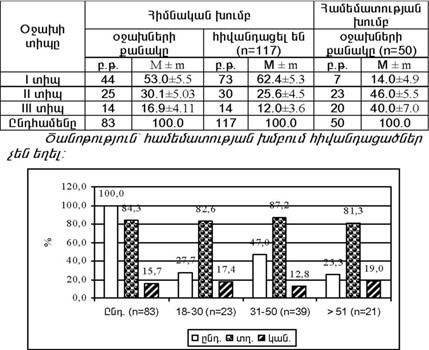 Ստորև ներկայացվում են օջախների տեսակարար կշիռը հիմնական և համեմատության խմբերում ըստ նշված դասակարգմանը, հիմնական խմբում հիվանդացածների քանակը (աղ. 1): Վարակի աղբյուրների սեռա-տարիքային կազմը (գրաֆ. 1):