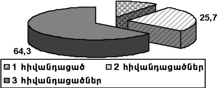 Ինչպես երևում է նկարից, այն օջախներում, որտեղ վարակի աղբյուրը տղամարդ էր, ավելի շատ էին 2 և 3 հիվանդացածների թիվը (25.7±5.2 և 10.0±3.6%), մինչ դեռ այն օջախներում, որտեղ վարակի աղբյուրը կին էր, 2 հիվանդացածների տոկոսը կազմում էր միայն 15.4±10.0 (p<0.05), իսկ 3 հիվանդացած ընդանրապես չի եղել, գերակշռում էին (84.6±10.0) մեկական հիվանդացածները: