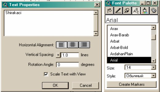 գործիքը, մկնիկով սեղմում ենք քարտեղի այն տեղի վրա, որտեղ անհրաժեշտ է գրել տեքստը կամ անունը, բացված Տեքստի Հատկությունները (Text Properties) երկխոսության պատուհանում գրում ենք անունը, ընտրում ենք հարմար հարթեցում, միջսիմվոլային ինտերվալ, պտտման անկյուն, OK. Տեքստը գրվում է էկրանին: Տեքստը փոփոխելու համար