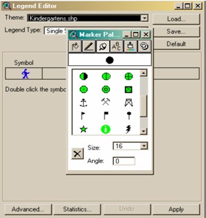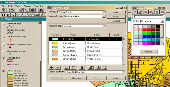 Գույնը փոխելու համար Տեսքի պարունակության աղյուսակում կրկնակի սեղմում ենք Թեմայի անվանման վրա, բացվում է Լեգենդի Խմբագիր (Legend Editor) պատուհանը: Խմբագրի Անվանումը (Label) պատուհանում մուտքագրում ենք Թեմայի անունը` Պոլիկլինիկաներ: Լեգենդի Տիպի (Legend Type) վայրընթաց ցանկում ընտրում ենք Եզակի Արժեք (Unique Value),որի օգնությամբ առանձին տարածքներ տարբեր գույներով կպատկերենք: Լեգենդի Տիպի վայրընթաց ցանկում Գունային Սանդղակ (Gradauted Color) կարելի է ընտրել այն դեպքում, երբ ցանկանանք պոլիկլինիկաների տարածքները դասակարգել օր` ըստ բնակչության թվի: Դա կարելի է անել Թեմայի Ատրիբուտային աղյուսակում համապատասխան դաշտ ստեղծելուց և այն լրացնելուց հետո: Այդ դեպքում Լեգենդի Խմբագրի Դաշտերի Դասակարգում (Classification field) պատուհանի վայրընթաց ցանկում ընտրում ենք “բնակչության թիվ” դաշտը: Ցանկության դեպքում կարելի է տարբեր գունային լուծումներ ստանալ Գույնի Գծային Փոփոխությունների (Color Schemes) ցանկից, կամ կրկնակի սեղմելով գույնի վրա, որի արդյունքում բացվում է Գույների Ներկապանակը (Fill Palette): Հաստատելու համար սեղմում ենք Կիրառել (Apply):